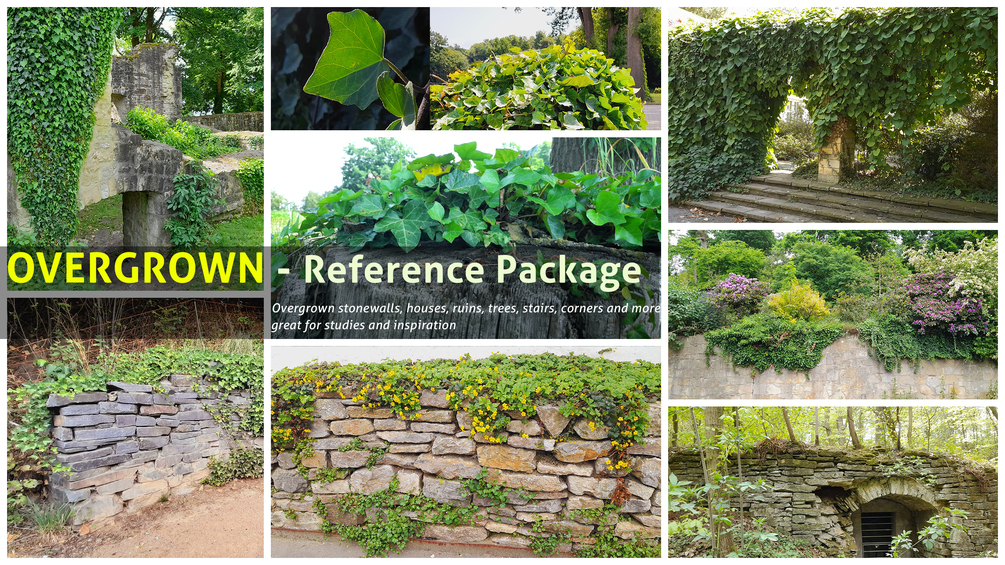 This is a reference pack with 380+ pictures. You will find big walls, little stonewalls, trees, houses, ruins, wall corners, and more covered with IVY and similar vegetation.
